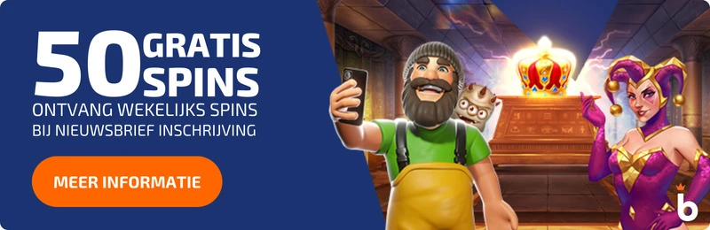 - Wekelijks 50 gratis spins bij nieuwsbrief inschrijving.